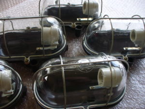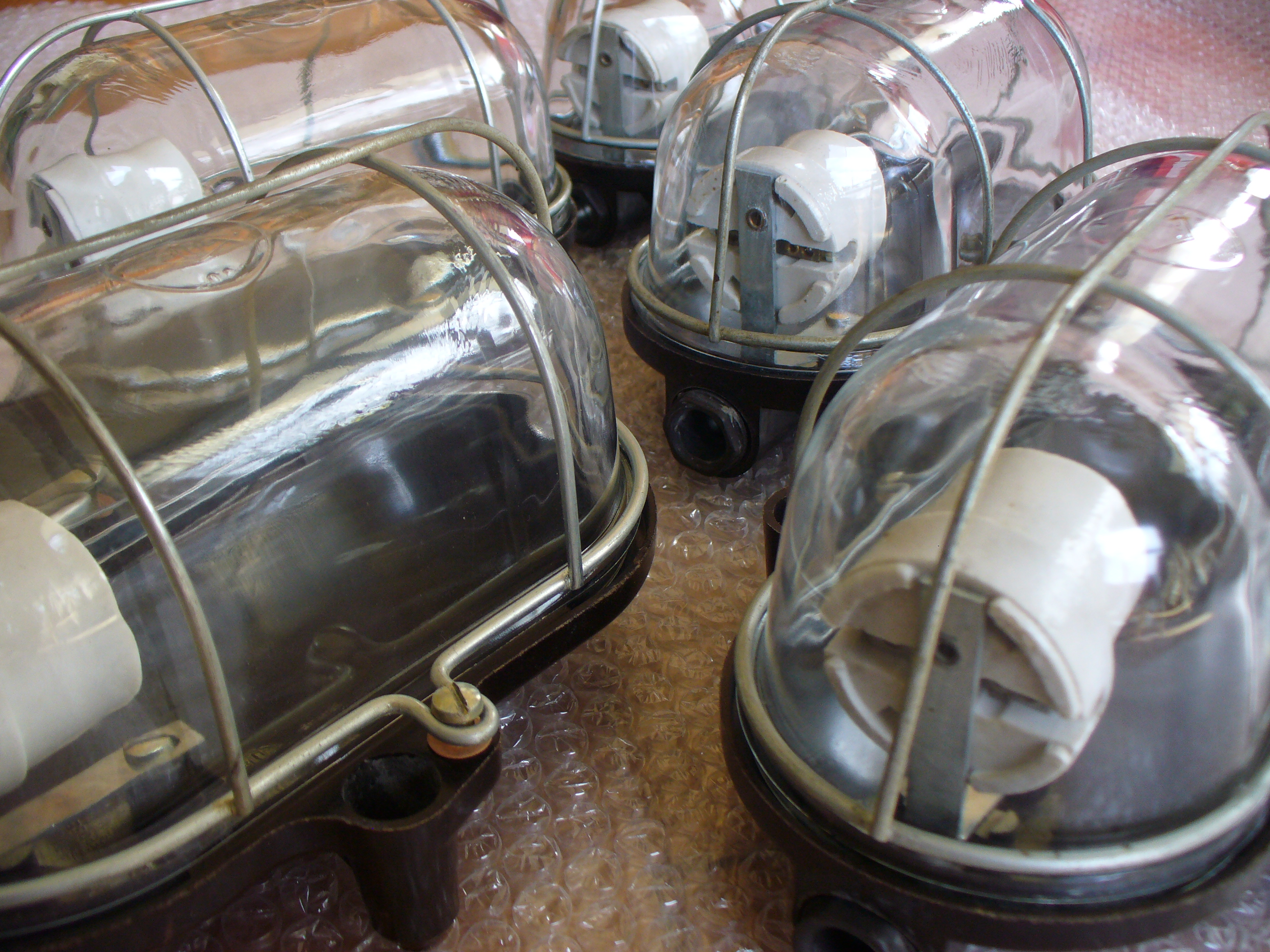 Nous avons restaurés pour un de nos clients cette série de 5 hublots de cave de la célèbre marque « BLOC », ce modèle est très utilisés dans nos caves et ateliers, dans les années 60/70 , corps en bakélite, verre très épais avec inscription « BLOC » sur le dessus du verre, grille de protection en acier, douille a baionette b22 en céramique neuve, modèle utilitaire et très robuste, cette série de 5 lampes est parti pour encore de nombreuses années ! modèle devenu rare en cet état, très design pour une déco loft et industrielle …