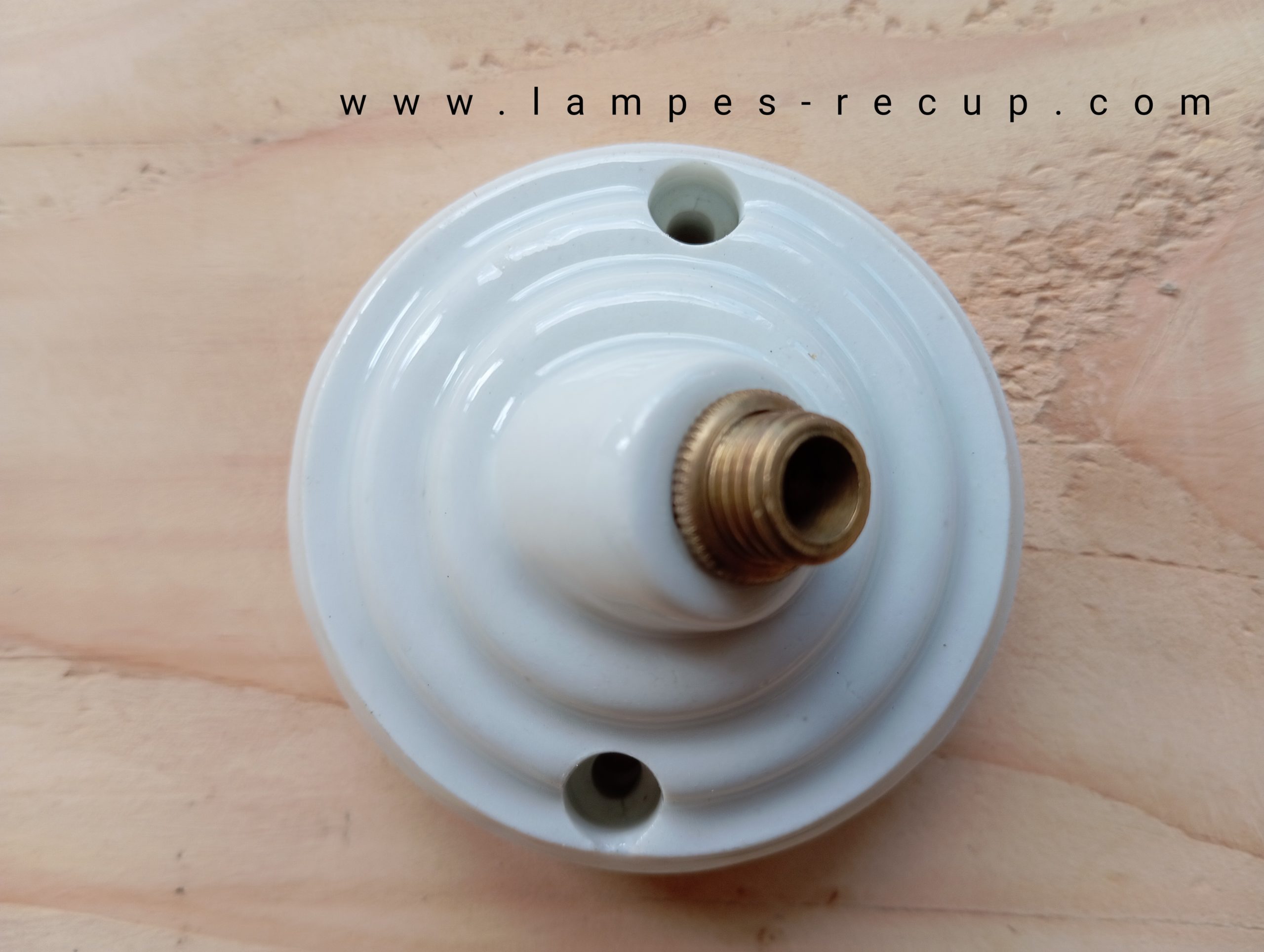 Ce type de matériel est très répandu dans nos belles maisons de village. Grace a sa platine en porcelaine vous pouvez y adapter beaucoup d’accessoires, comme des tulipes ou des réflecteurs émaillés. Le pas de vis ancien ( pas de vis français ) ne permet pas d’installer une douille moderne, car le pas de vis actuel a une cote de 10mm. Les douilles anciennes pour ce type d’installation possède généralement 2 bagues qui permette l’installation d’une griffe en laiton. Ces griffes pour luminaires sont de deux type, celle avec un trou de 11mm doit être installée entre la douille et la porcelaine. La griffe de 57 mm est serrée entre les deux bagues.