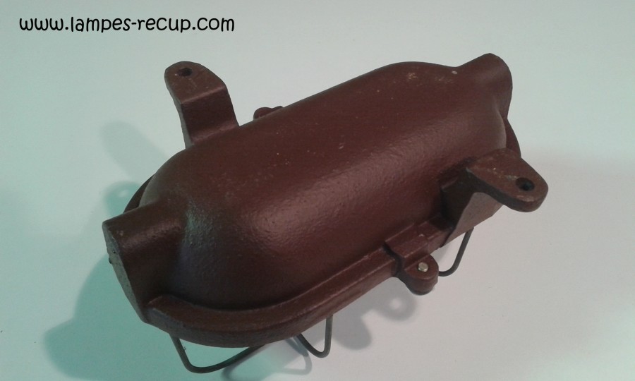 hublot applique fonte industriel marque TH, occasion, en bon état de présentation et de fonctionnement malgré quelques traces de son passé industriel, ses dimensions sont de 24 cm de long et 13 cm de large, il se fixe généralement en applique grâce a ses deux pâtes de fixation , son socle en fonte et son verre très épais marqué » TH » lui ont permis de traverser le temps jusqu’à nous, il est équipé d’une douille en porcelaine de type E27 ou l’on peut installer une ampoule a vis classique .