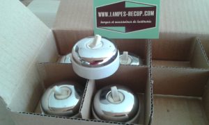 Interrupteur ancien porcelaine et chrome simple allumage , article neuf et d’époque ancien stock de quincaillerie , diamètre de 5.5 cm et épaisseur de 2.6 cm .Ce modèle permet de commander un ou plusieurs point lumineux , mais d’un seul endroit . Ce matériel électrique ancien ne correspond plus aux normes actuelles , mais il peut encore être utilisé comme un interrupteur moderne ( en plastique ) ref: iasa5207 / iasa5208 / iasa5209 .